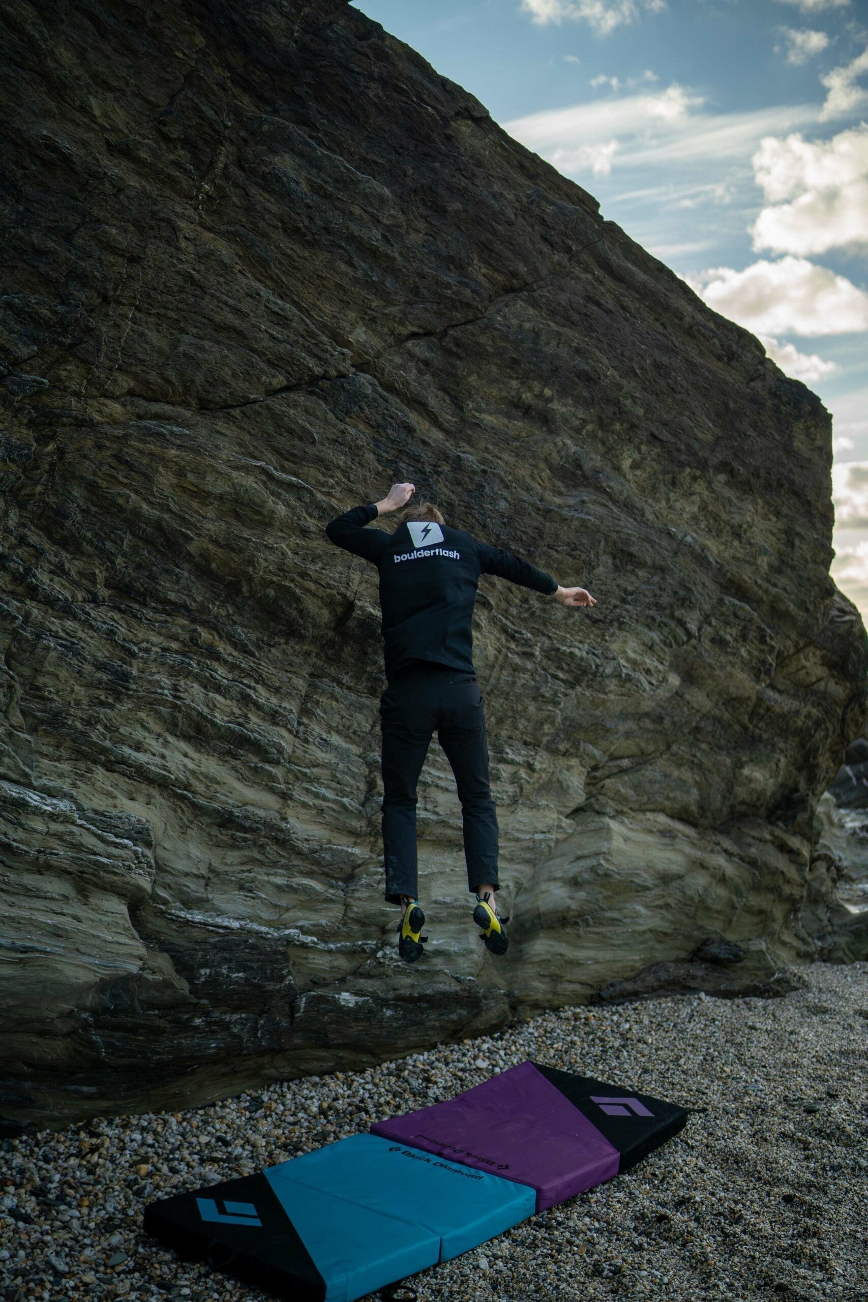 Test out the landing before climbing. Jump up and down on the pads, imitate a potential fall, or do a belly flop (don’t really do a belly flop). You want to observe if the pads slide away from each other and ensure they’re in the proper place under the boulder.