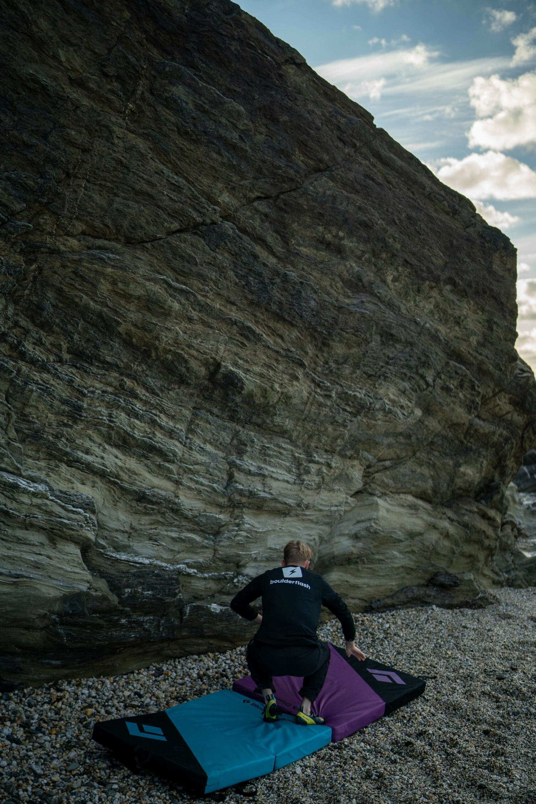 Test out the landing before climbing. Jump up and down on the pads, imitate a potential fall, or do a belly flop (don’t really do a belly flop). You want to observe if the pads slide away from each other and ensure they’re in the proper place under the boulder.